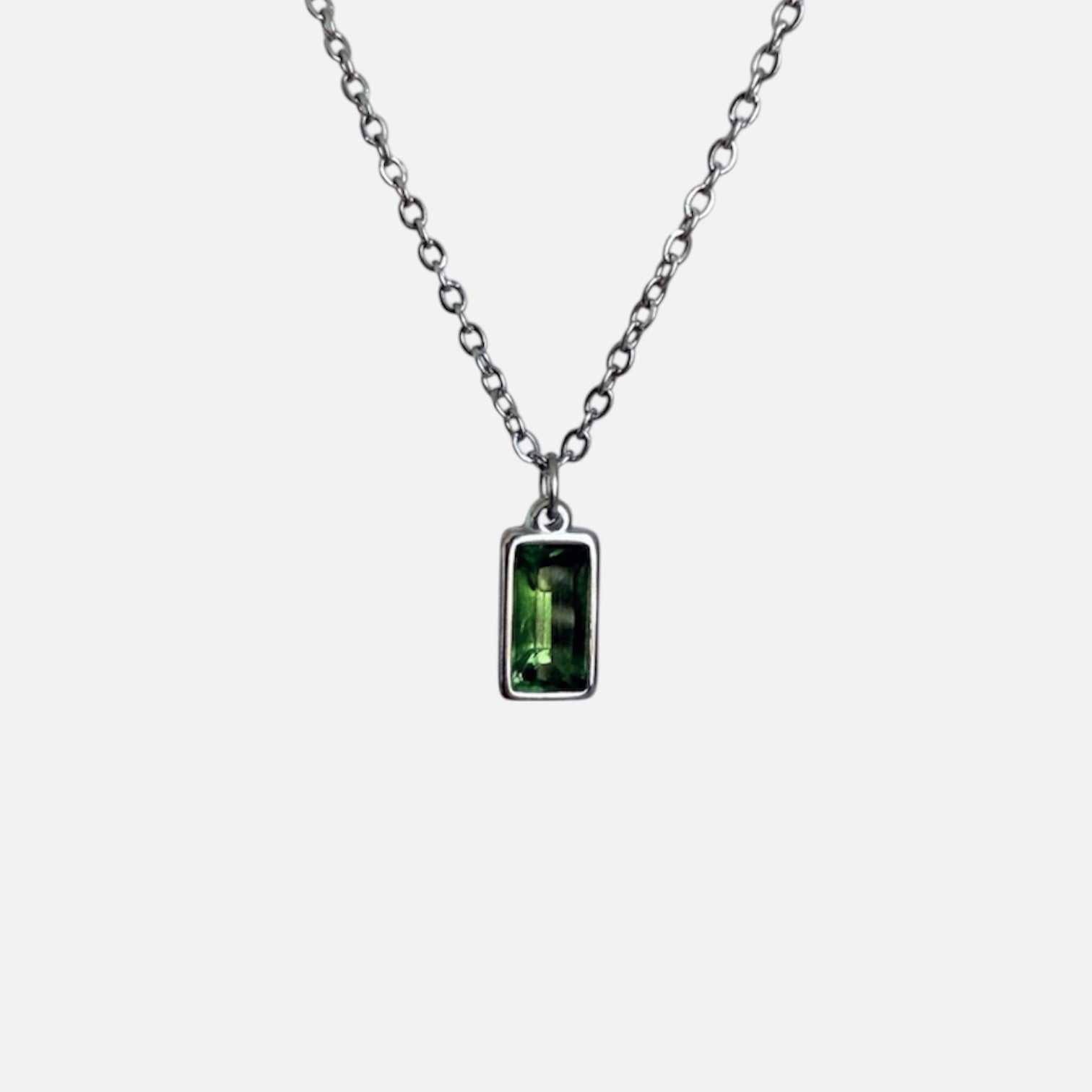 Cadena de acero inoxidable (disponible en plateado y dorado) con un colgante brillante en tono verde que no pasa desapercibido. Un básico con actitud para elevar cualquier fit.