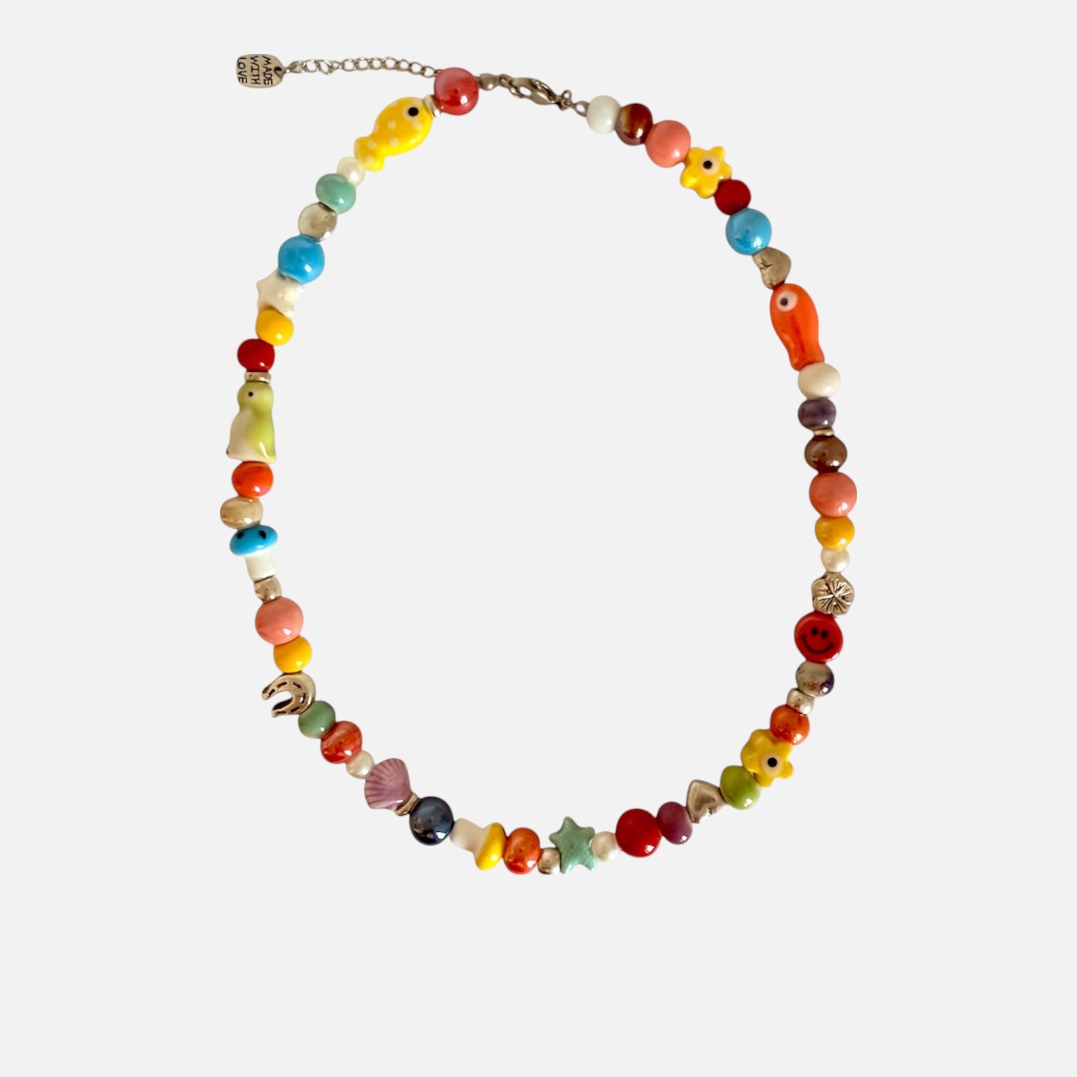 Collar hecho a mano, donde cada abalorio de cerámica en distintas formas y colores cuenta una historia de verano y libertad. Las perlas de nácar y los detalles en acabado plateado le dan un aire elegante y versátil, perfecto para llevar esa energía fresca contigo.
